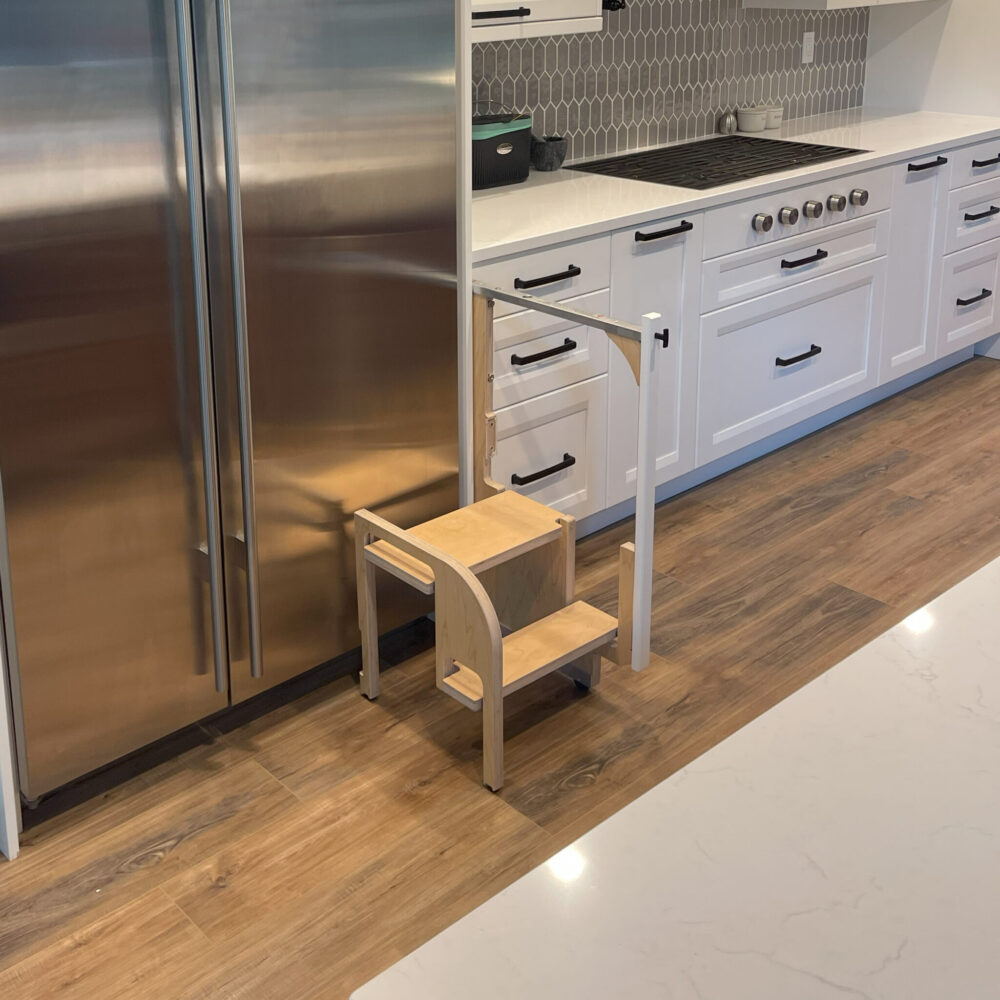 The STEP 180 DUO is our line of 2-step cabinet step stools. Taking up just 1 ½” (38mm) of cabinet width with its unique ability to flip 180 degrees, opening in either direction. These fixed step ladders give you the fast and easy access to a volume of upper cabinet space, and for children, easy access to sinks and helping at the countertop level.